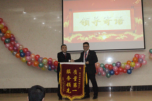 接着,杨海明先生发表讲话,他对生产基地今年取得的成绩表示热烈的祝贺,并感谢咸阳生产基地2017年在产品、服务、物流方面提供的协助。张程先生也对咸阳生产基地一如既往地提供支持表示衷心感谢,并赠送致谢的锦旗。